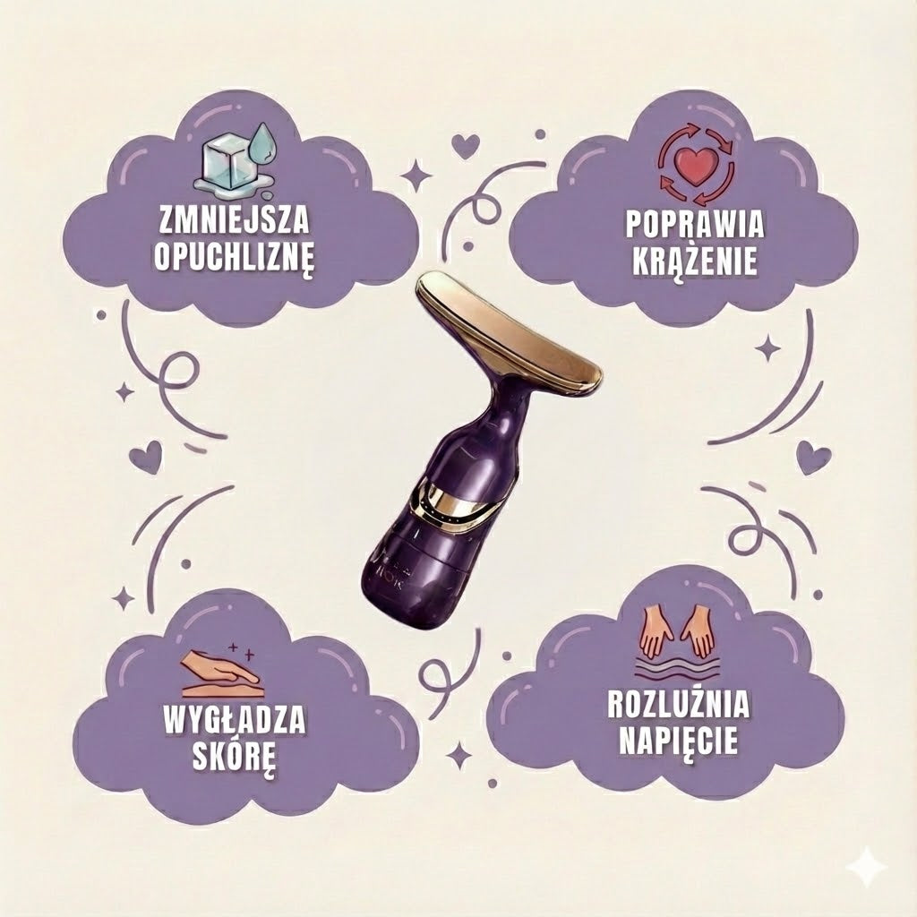 Luminacare wykorzystuje połączenie ciepła (45°C) i wibracji sonicznych, aby dotrzeć do głębokich napięć, których nie usunie zwykły masaż. Urządzenie precyzyjnie rozluźnia „zestresowane” obszary twarzy.